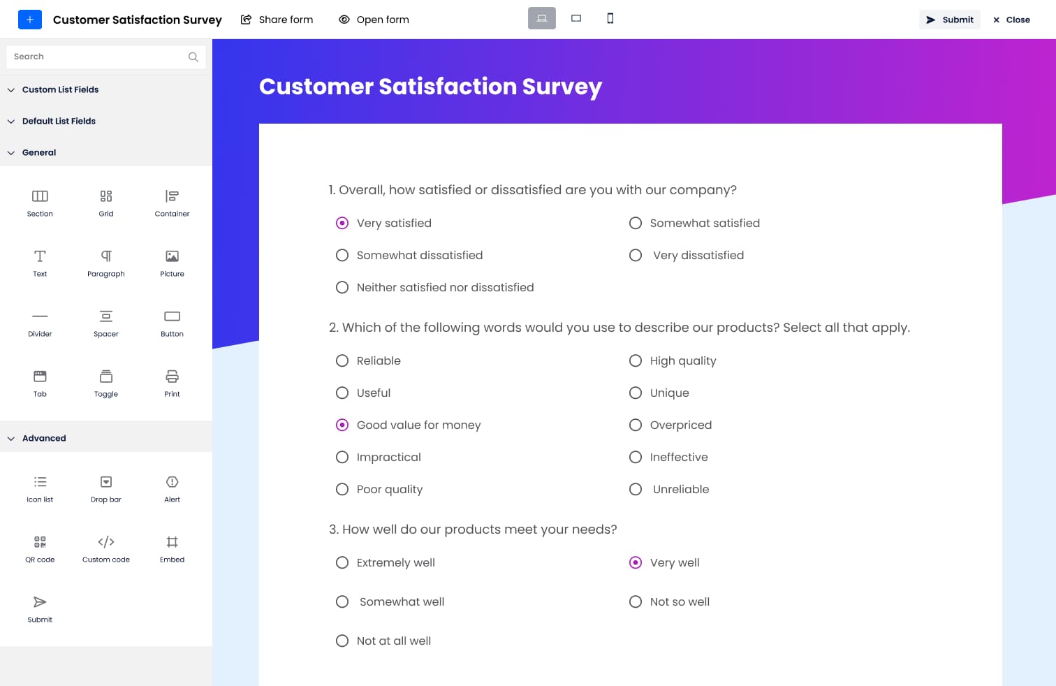 易企办的表单设计器提供了丰富的字段和控件,支持自定义表单布局和样式,让您能够根据具体的数据收集需求快速设计表单。