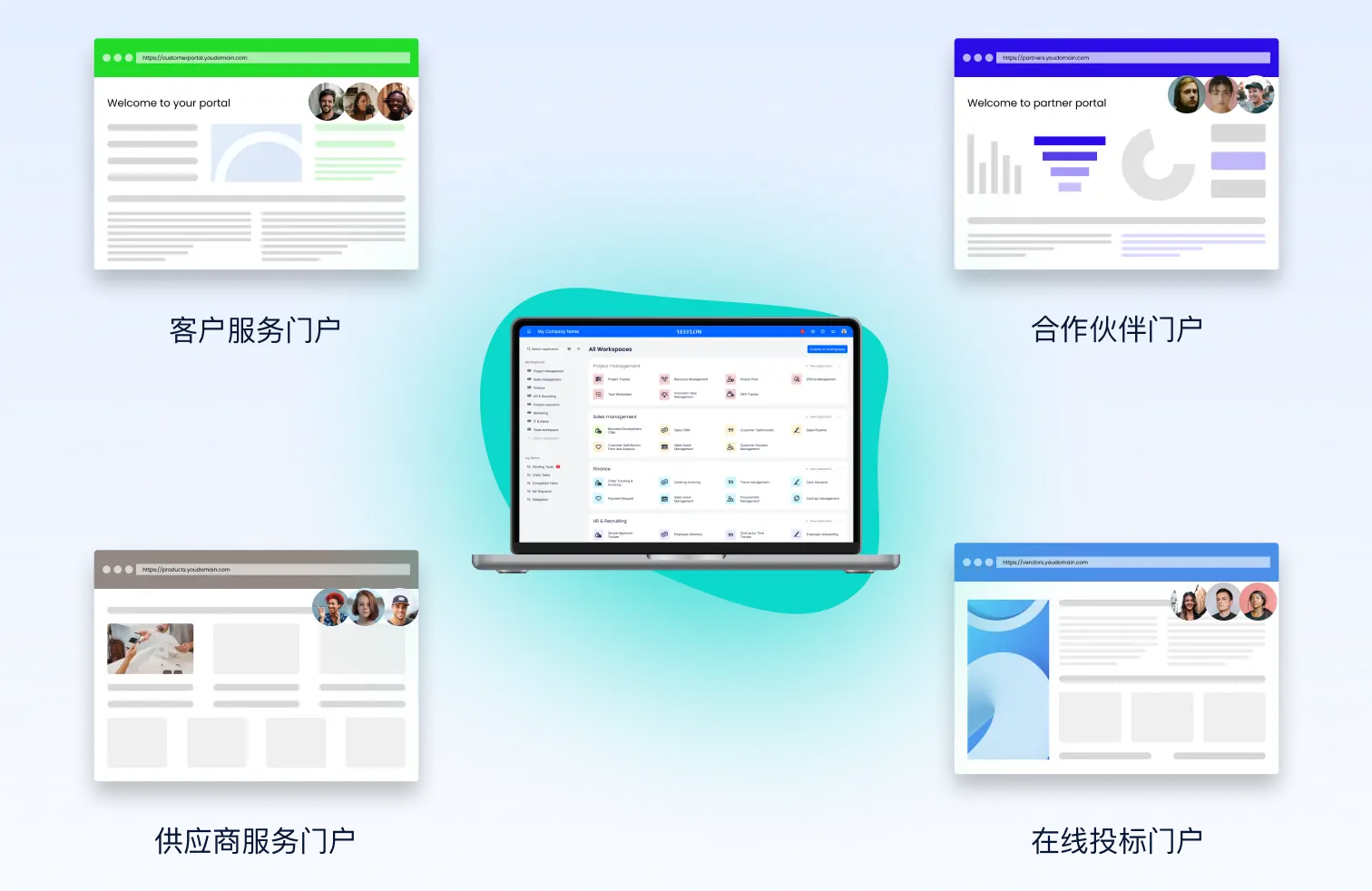 易企办支持创建各种服务门户,包括客户门户、供应商门户、合作伙伴门户和员工门户。每种门户类型都可以定制以满足特定的业务需求。